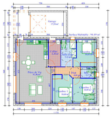Cette maison de 94.49m² offre 3 chambres, une pièce de vie avec cuisine ouverte sur salon,